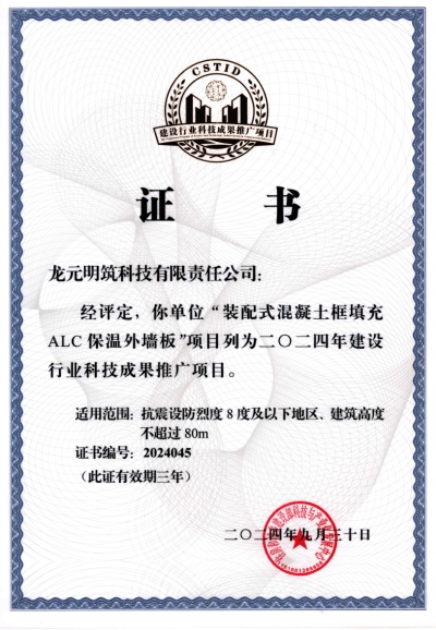 近日,由龍元集團生態成員單位龍元明筑研發的“裝配式混凝土框填充ALC保溫外墻板”成功通過住房和城鄉建設部科技與產業化發展中心科技成果評估,獲評2024年建設行業科技成果推廣項目。 《建設行業科技成果推廣項目》是建設領域的國家推廣項目,對促進科技成果...