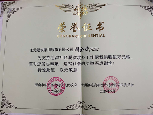 2017年9月,周全茂代表龍?jiān)瘓F(tuán)向陜西渭南華州區(qū)捐贈10萬元,幫助了80名當(dāng)?shù)貎?yōu)秀大學(xué)生和困難學(xué)生,支持他們追尋夢想;