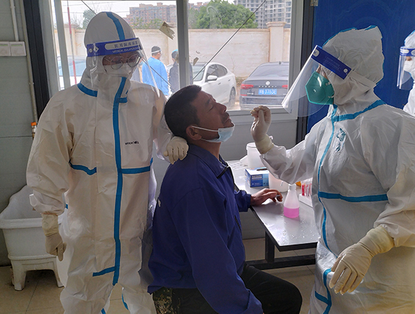 4月28日下午,項目部召集管理人員,召回現(xiàn)場工人,迅速組織開展全員核酸檢測工作。信息核對、樣本采集、樣品分裝等各個環(huán)節(jié)忙而不亂,急而有序,項目管理人員全部出動,2個半小時配合醫(yī)護人員完成項目部全員1220人核酸采樣工作。