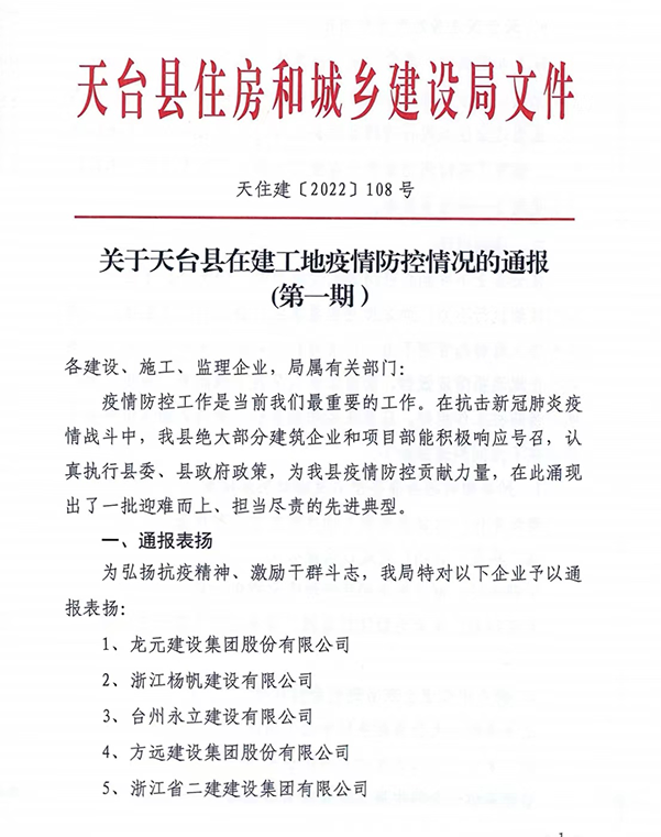 5月1日勞動節(jié),項目部收到了來自天臺縣住建局的通報表揚:“表揚龍元建設能在戰(zhàn)“疫”危急時刻,主動馳援,充分發(fā)揮企業(yè)優(yōu)勢,積極履行縣里政策要求,對縣內封控區(qū)周邊全區(qū)域進行硬隔離防護工作,用自己的方式支援疫情防控,譜寫了新時代企業(yè)的社會責任與擔當,為天臺縣抗擊疫情防控筑起了一道堅實屏障。”
