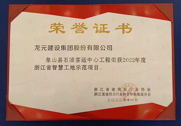 近日,龍元建設集團石浦客運中心工程PPP項目部收到了省建筑業協會頒發的2022年度浙江省智慧工地示范項目證書。這是繼集團杭州市城市檔案中心(一期)工程被評為浙江省智慧工地示范工程后,再獲此殊榮。